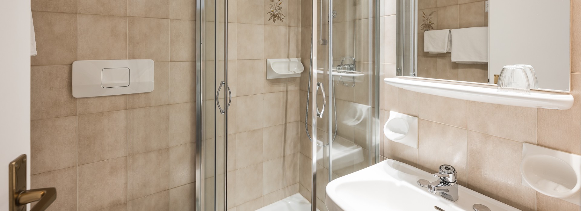 Bad mit Dusche, WC, Föhn und Seifenspender