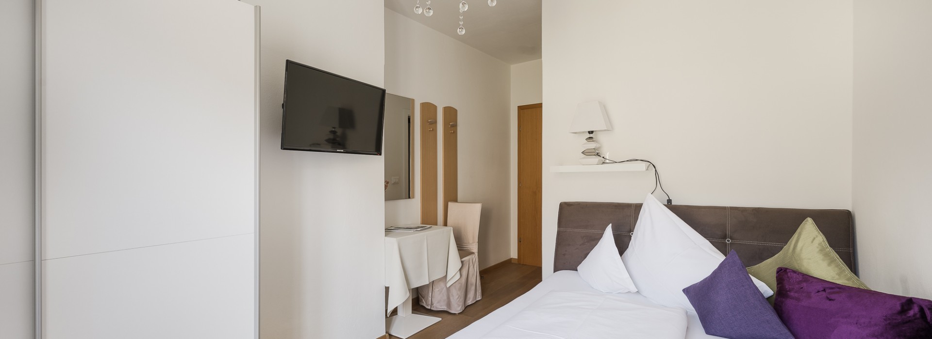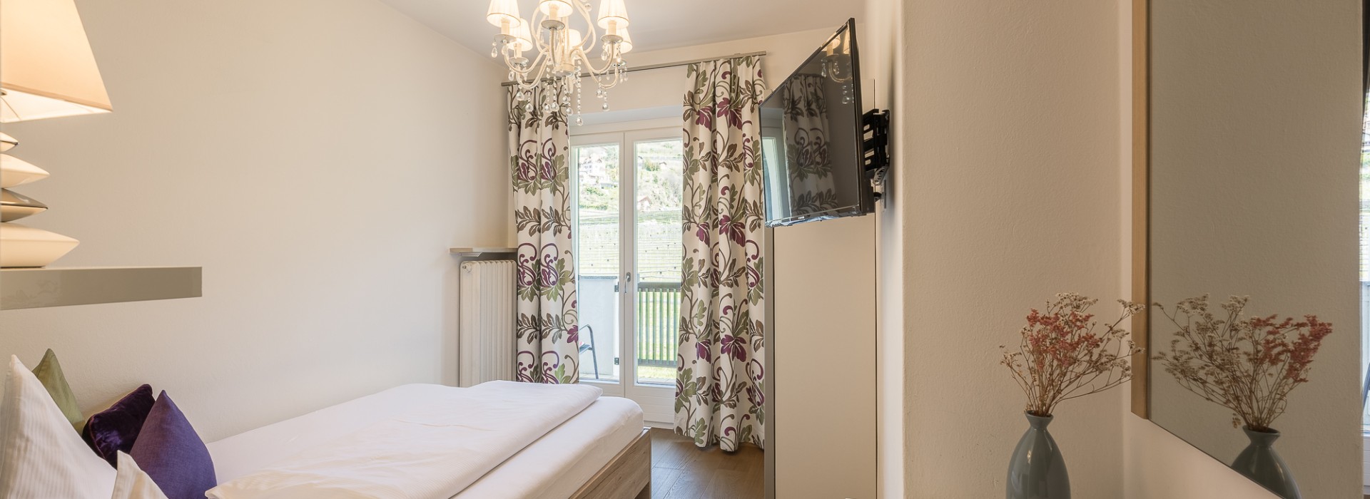 Von der Morgensonne geweckt werden Sie in unserem Einzelzimmer. Im 2. Stockwerk bestaunen Sie unseren Hausberg Ifinger und Schenna.