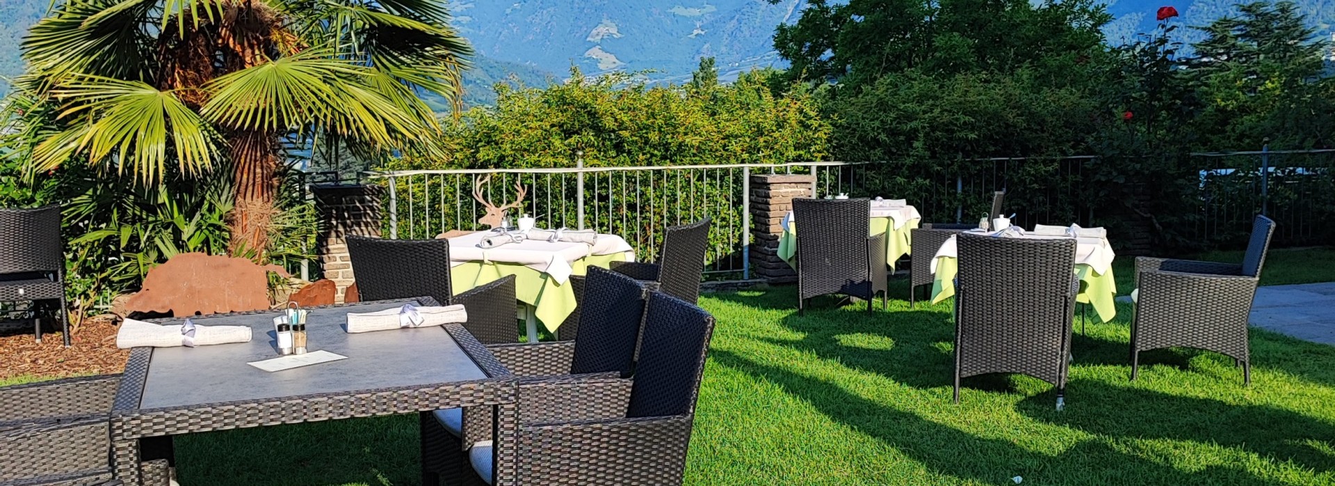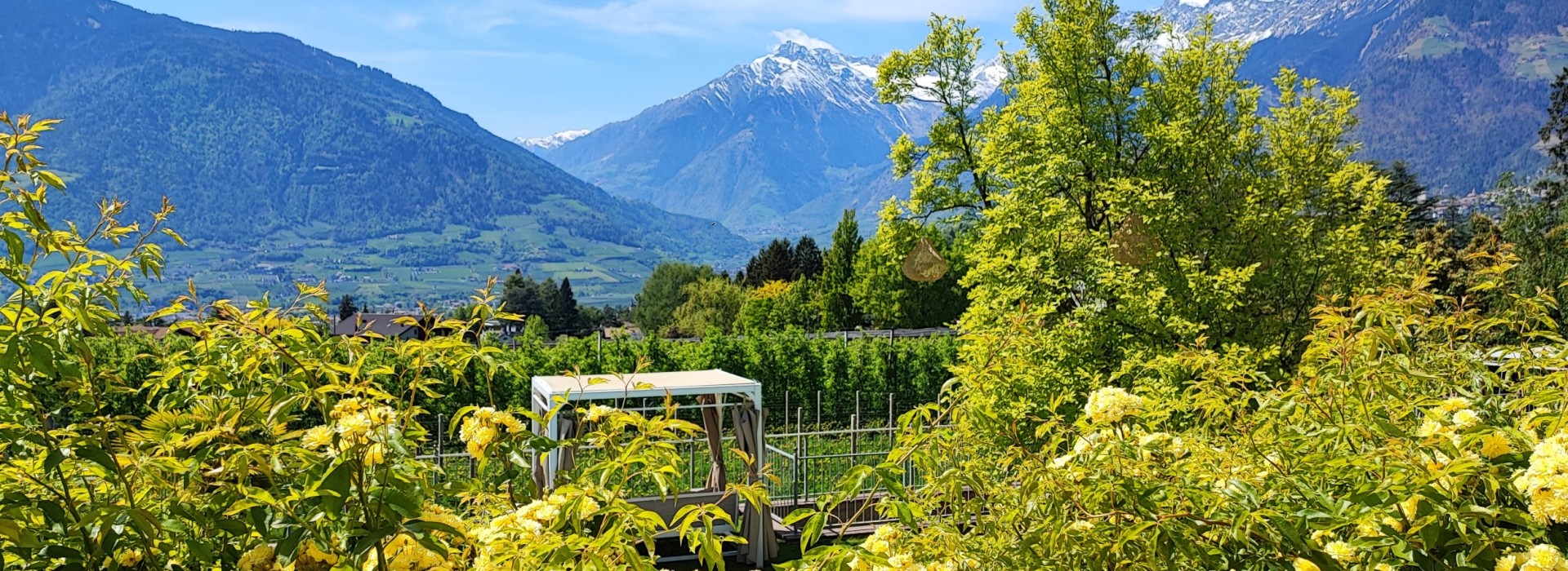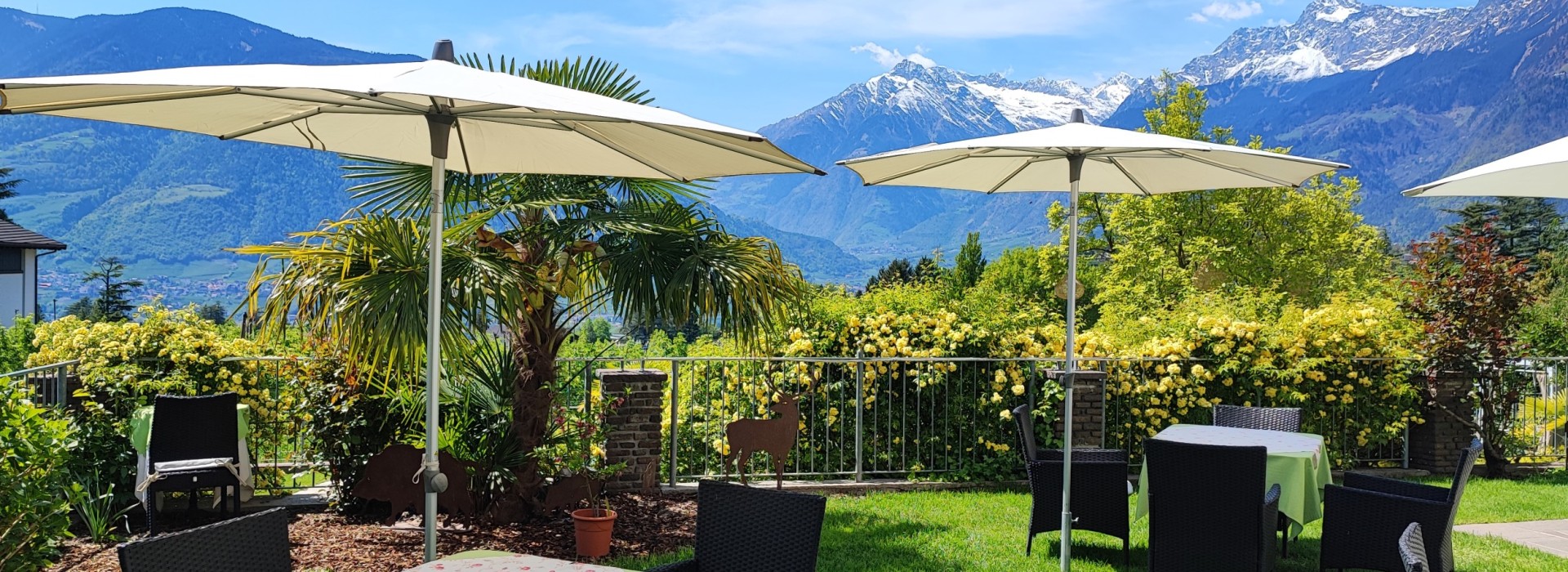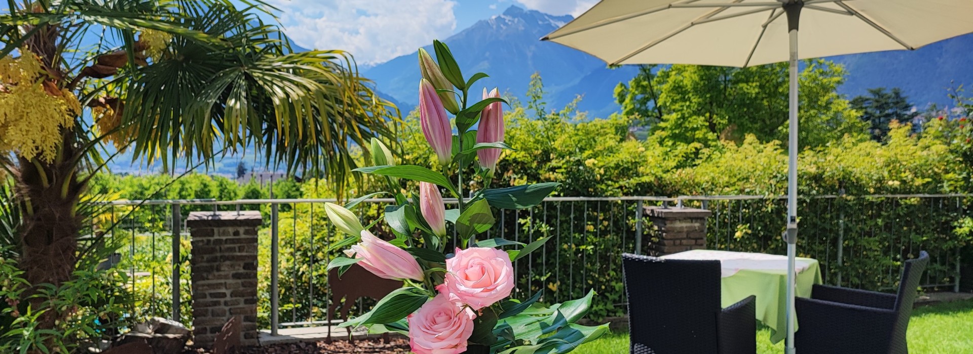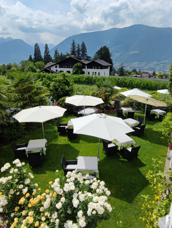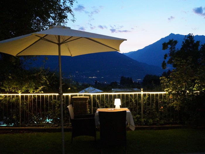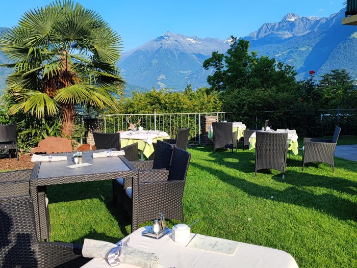 On our terrace, you can enjoy the first shafts of sunlight and get power for the day with an extensive breakfast. In the afternoon, we pamper you with coffee and self-made cake. Between roses, palm trees and lemon trees you enjoy our garden with a view in the direction of Val Venosta. With total pleasure, we also mix cocktails like Hugo, Ginger Spritz, Aperol Spritz a glass of South Tyrolean wine, homemade raspberry juice, various apple juices and many other specialities for you.
