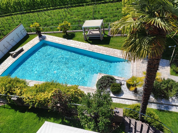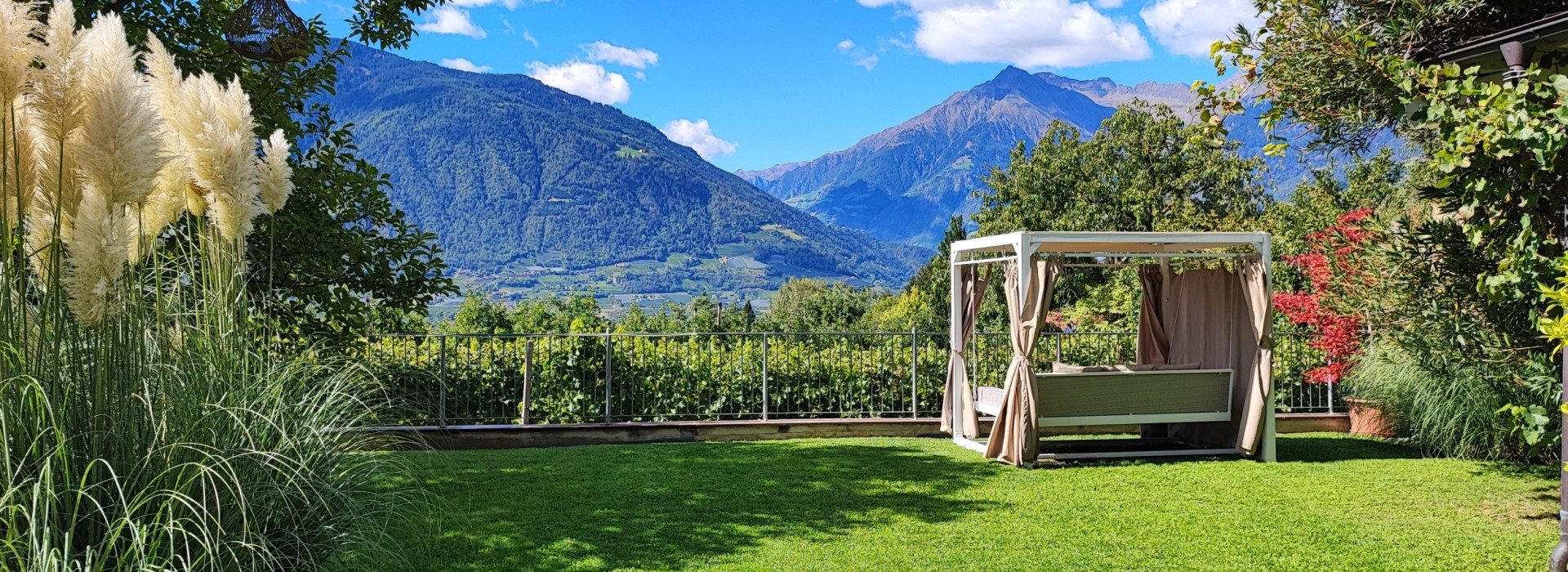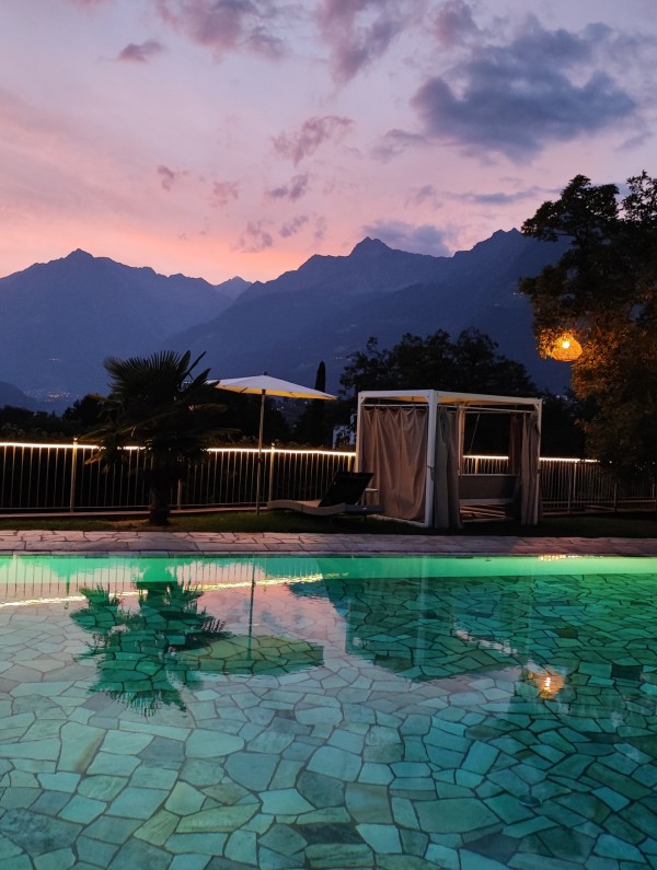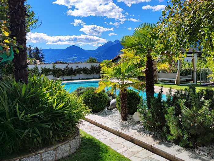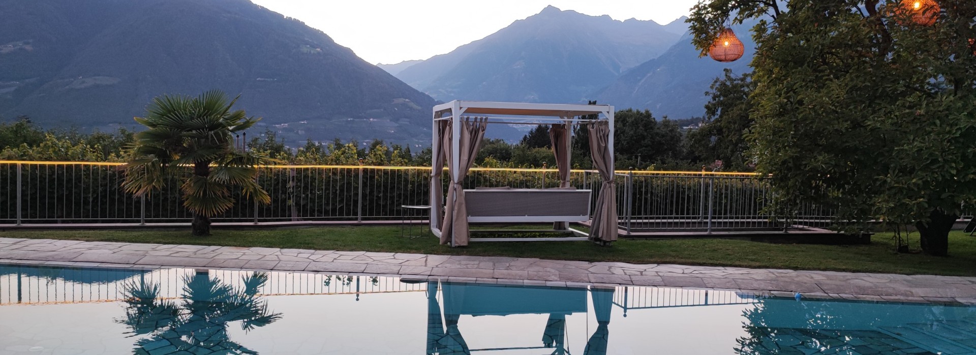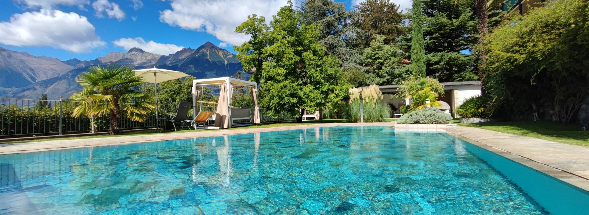 Immersa nel giardino del B&B si trova la nostra piscina in pietra, con panca massaggio integrata. Dalla piscina si ha una splendida vista panoramica su Merano e sulle montagne del Parco naturale Gruppo di Tessa. Inoltre, offriamo l’utilizzo gratuito di lettini e ombrelloni per rilassarsi a bordo piscina. L'uso della piscina è consentito da aprile a ottobre. Durante le calde giornate estive, concediti un breve momento di tranquillità e relax per un buon riposo o un buon risveglio per corpo e spirit